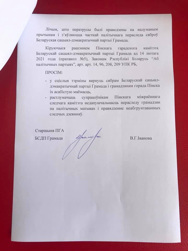 Организация просит разъяснить сотрудникам Пинского МО СК невозможность преследования граждан в нашей стране по политическим мотивам и необоснованность следственных действий, которые произошли 8 февраля.