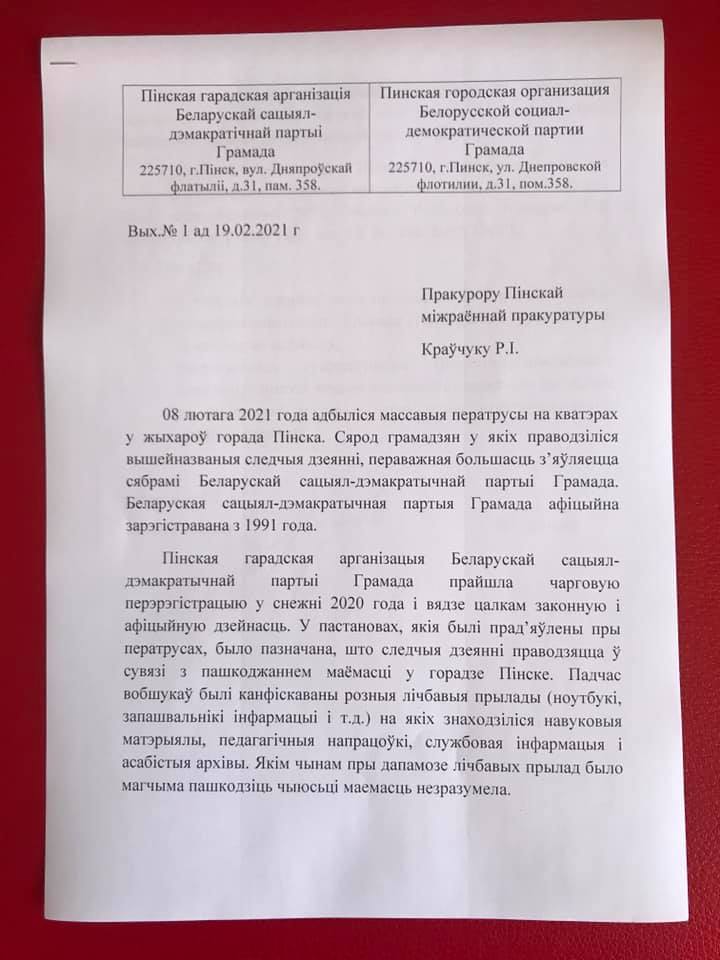 Массовые обыски прошли у членов пинской организации БСДП (Грамада) 8 февраля. Как отмечают авторы заявления, обыски проводились по надуманным причинам, следственные органы ищут лиц причастных к повреждению имущества в Пинске. В организации недоумевают, каким образом с помощью конфискованной электроники и запоминающих устройств можно было повредить городское имущество.