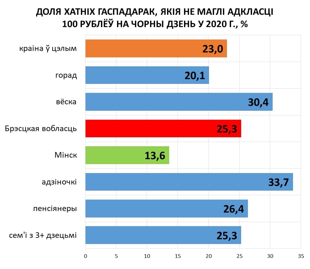 К концу 2020 года работников предприятий флагманов, которые не имели тысячу за месяц в своем кошельке в Бресте оказалось 47,6%, в Барановичах — 60,3%, в Пинске — 61,1%. Самые бедные регионы Брестчины — Столинский и Дрогичинский районы, где 75,9% и 74,7% работников не дотягивали до этой суммы.