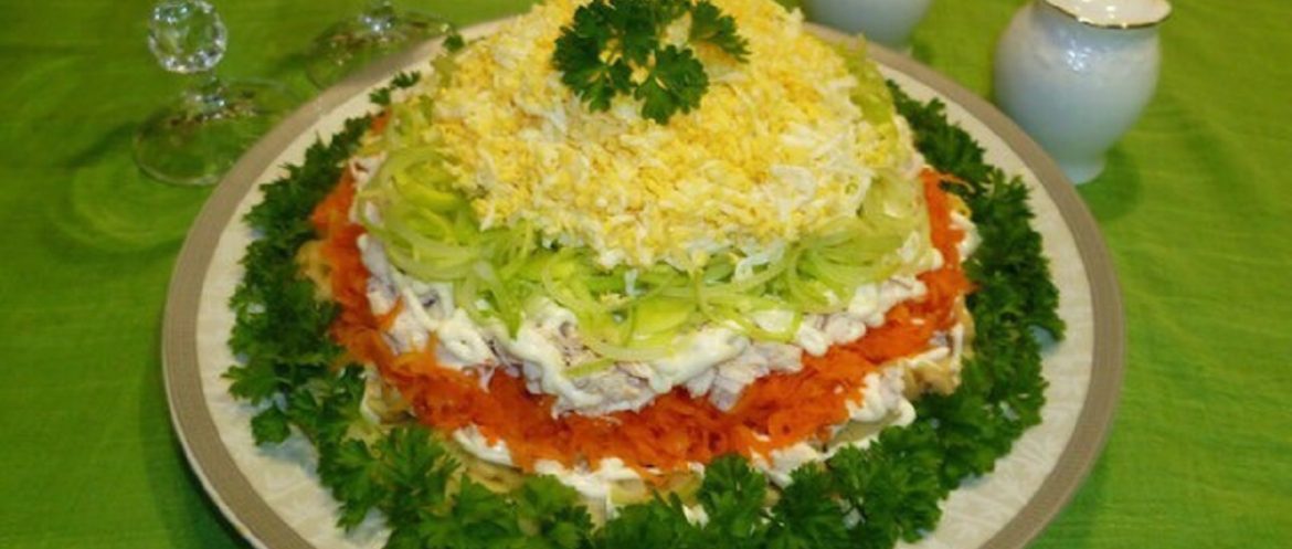 Салат очень яркий, вкусный и сытный. Рекомендуем использовать именно лук порей, он придает салату интересный вкус. Из указанного количества ингредиентов получается 6–8 порций.