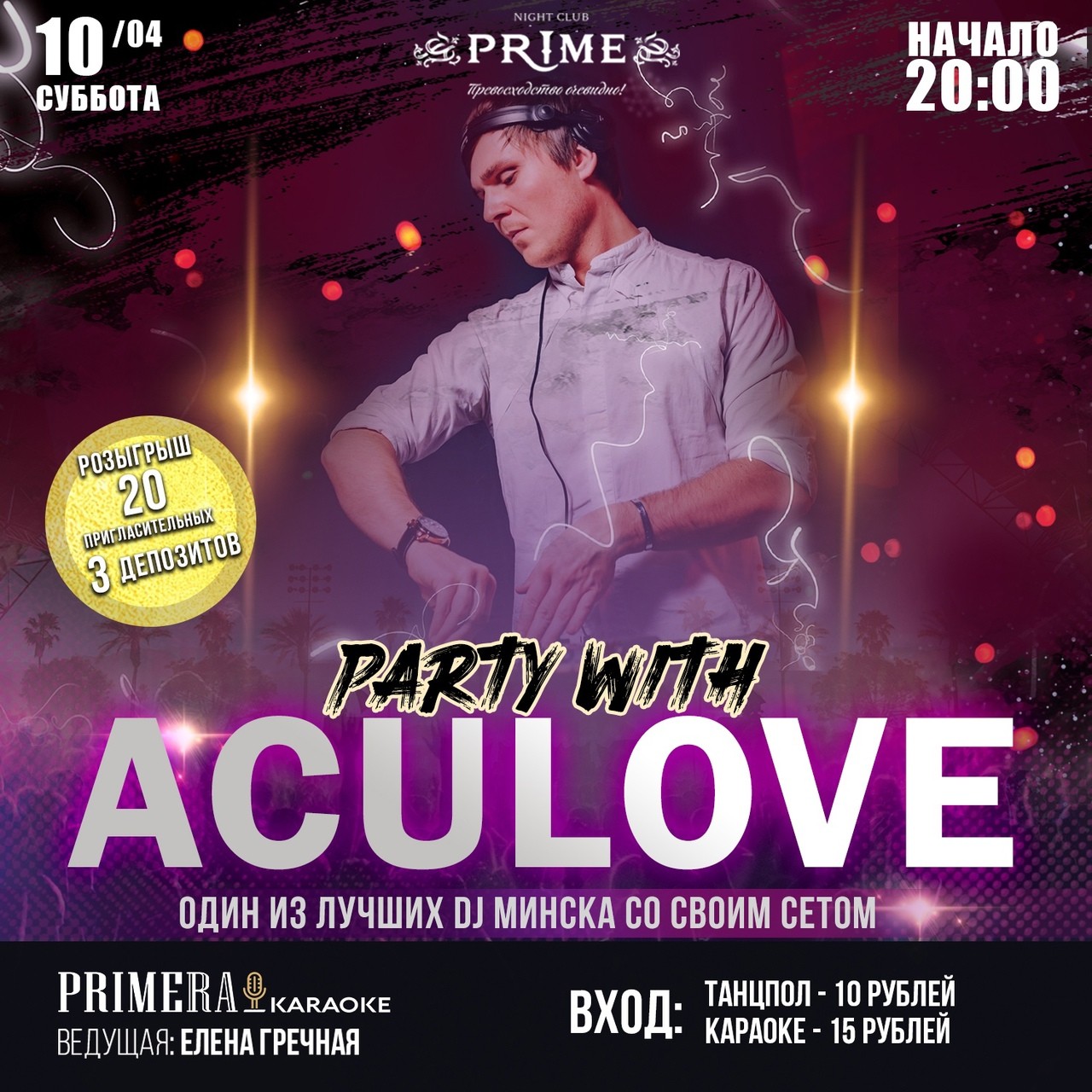 Один из лучших DJ Минска выступит со своим индивидуальным сетом в ночном клубе PRIME, равнодушным не останется никто. Эту ночь вы не должны пропустить, ведь не каждый день выпадает возможность услышать подборку лучших треков в исполнении мастера своего дела.