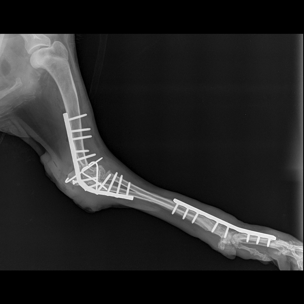 После операции и продолжительного лечения, задняя лапка полностью восстановилась, а вот передняя, после артопротезирования, которое сделали в городе Лида в клинике «Кот Бегемот», требует реабилитации.