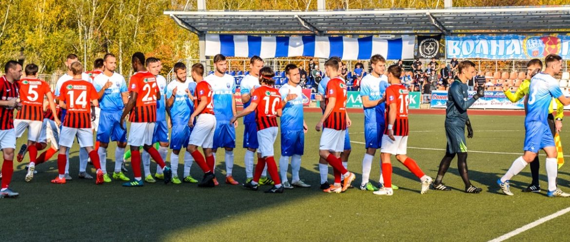 14:32 — угловой у ворот «Волны». Навес в район 11-метровой отметки и плотный удар, но мимо.