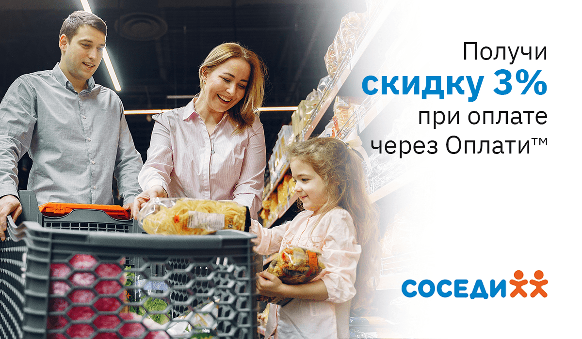 В приложении, в разделе «Где принимают» мы узнали, что гипермаркет «Соседи» в Пинске по адресу ул. 60 лет Октября, 13 предоставляет скидку 3%* с каждой покупки по Оплатитм. А это, помимо легкости и удобства платежей, еще и возможность немного сэкономить! Приятная новость!