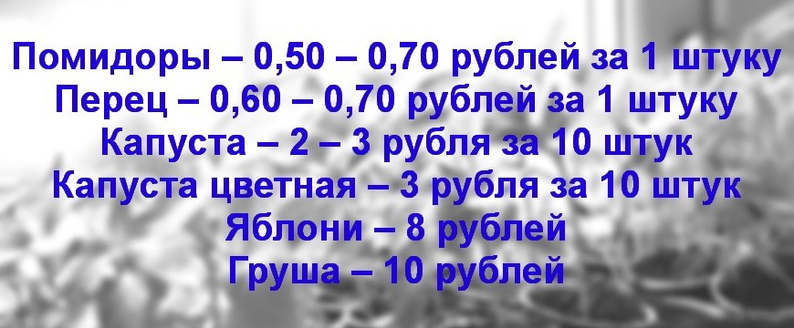 Особым спросом сейчас пользуются саженцы и рассада. Из-за холодной погоды продавцов еще не так много, может, поэтому и цены не такие уж и доступные. Цены на рассаду и саженцы на этой недели следующие: