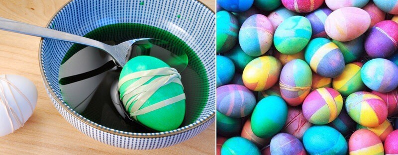 Яйца красят традиционным методом, опуская в ёмкость с красителями. Но в данном случае можно легко разнообразить пасхальный продукт. Самое простое — обернуть яйцо резинками в разной последовательности. В этом случае оно станет полосатым.