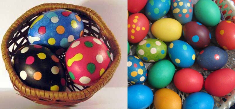 Яйца красим традиционно в красителях. После дают ему остыть и высохнуть. На яйцо капают горячий воск, капли разной величины и последовательности. Уже потом можно продолжать красить это же яйцо другими красителями. Этот пасхальный атрибут получится разноцветным и пятнистым. На неокрашенных яйцах капли воска будут белого цвета.