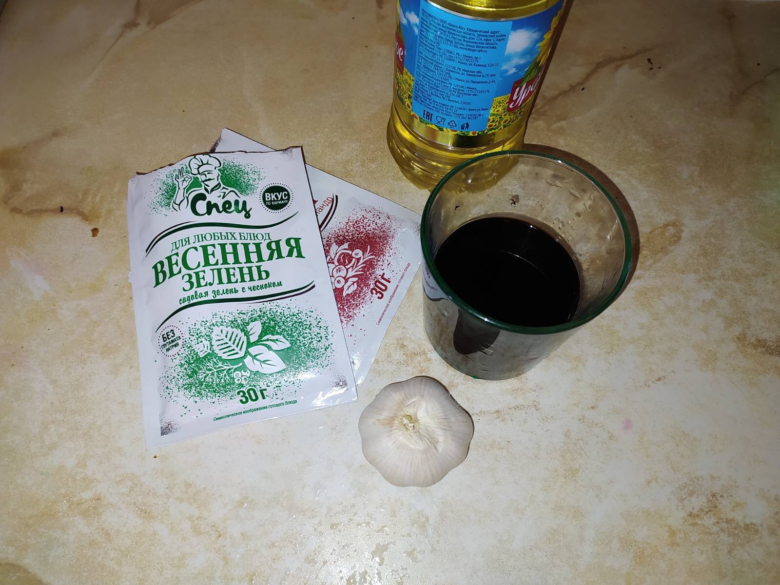 -На разогретую сковородку выкладываем чеснок и даём ему подрумяниться на мелком огне. В процессе добавляем приправы и мелко нарезанную зелень (её в самом конце для запаха);