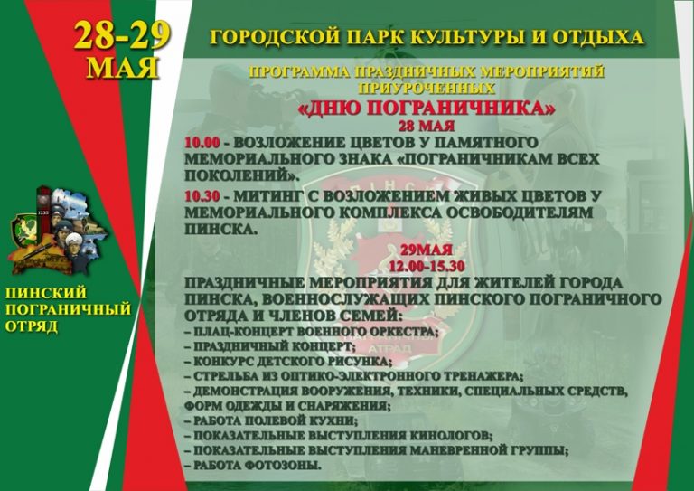 Часть праздника в этот день запланирована и в Пинске. Сегодня, 28 мая, Пинский погранотряд поучаствует в двух мероприятиях. Пройдут они у памятного знака «Пограничникам всех поколений» и Мемориального комплекса освободителям Пинска. Первое торжество будет в 10:00, второе в 11:00.
