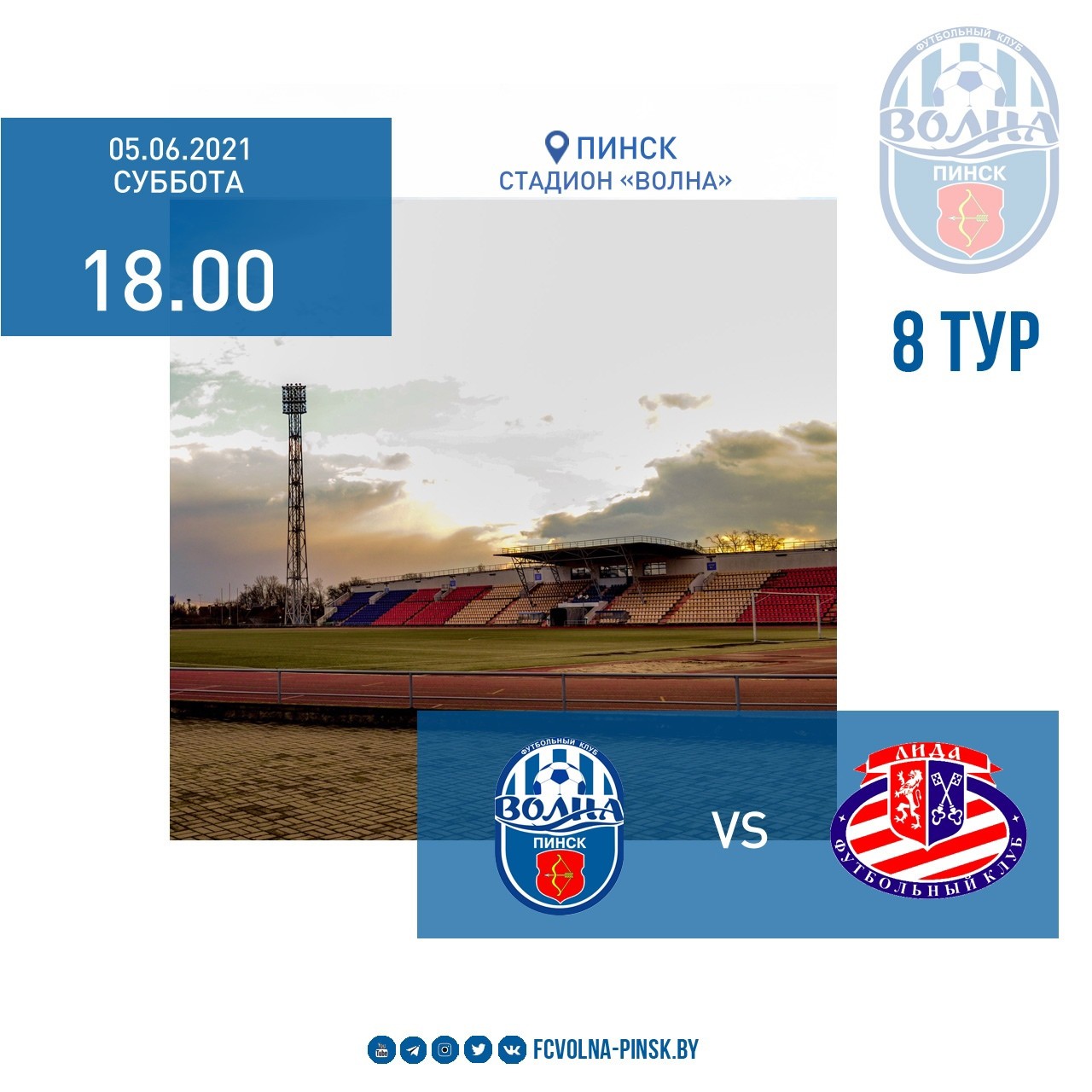 В субботу, 5 июня, в Пинске на стадионе «Волна» ФК «Волна-Пинск» будет принимать ФК «Лиду». Начало игры в 18.00.