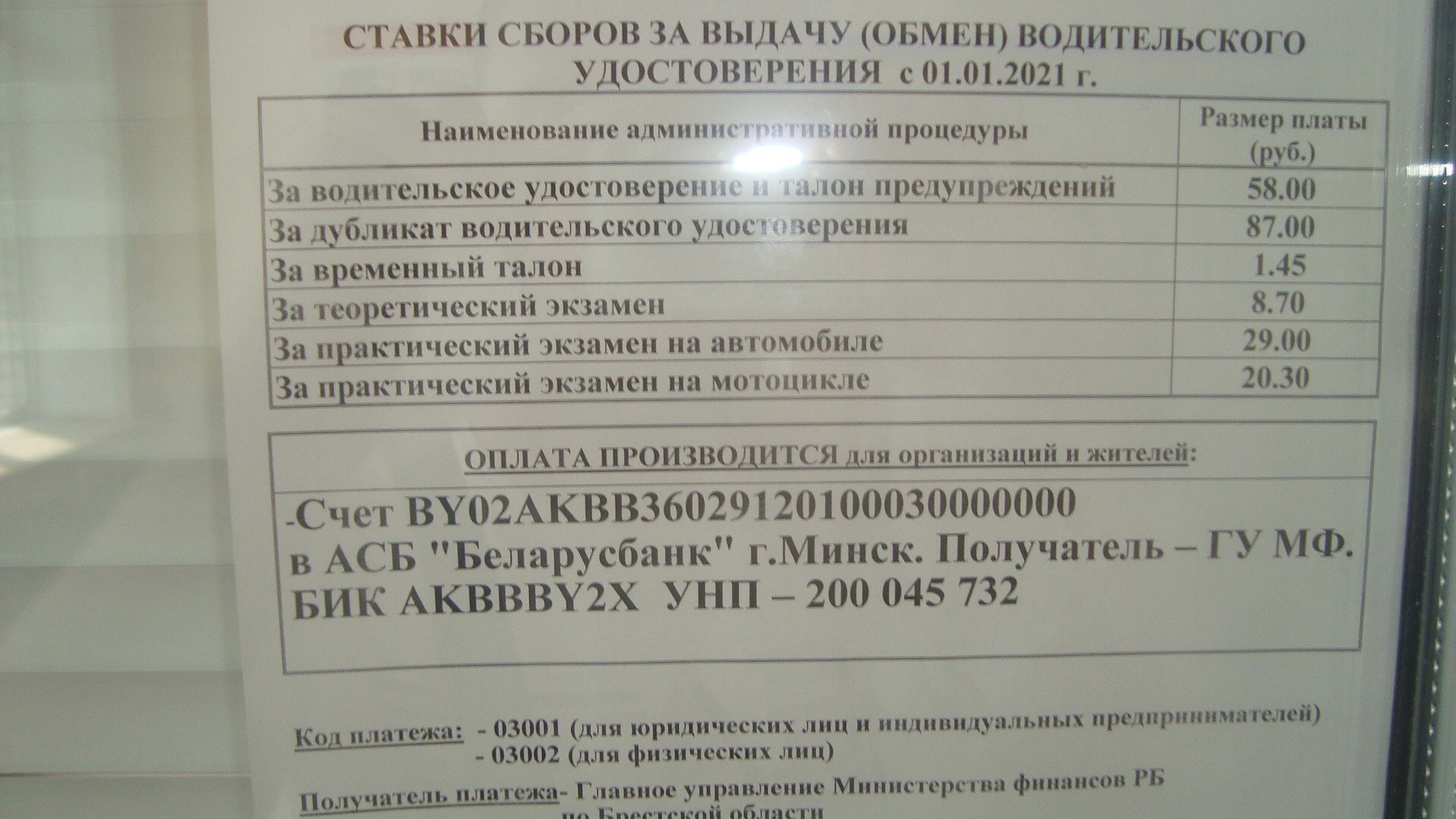 Сейчас замена водительского удостоверения стоит 61,48 рублей. Из них 58 рублей для замены водительских прав (2 базовых величины), 1,16 рублей за компьютерные услуги и 2,32 рубля за оформление заявления. Здесь же на третьем этаже есть терминал, в котором можно оплатить как наличными деньгами, так и карточкой.