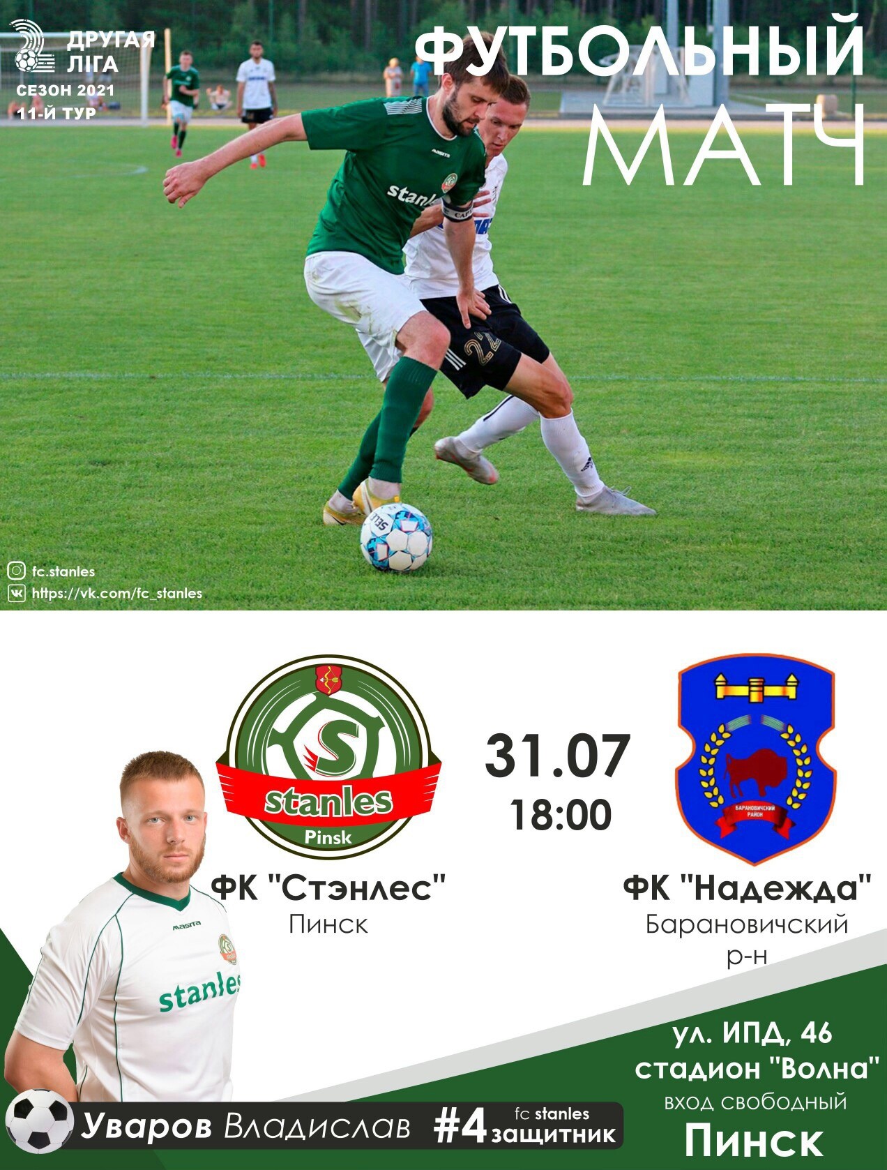 Сегодня, 31 июля, пинский «Стэнлес» в 11 туре второй лиги принимает «Надежду» из посёлка Городище Барановичского района. В первом круге пинчане с трудом одержали победу на выезде. «Стэнлес» выиграл тот поединок со счётом 4:2, но практически весь второй тайм вёл с разницей в один мяч.