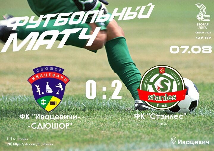 «Ивацевичи-СДЮШОР» на своём поле уступили «Стэнлесу» — 0:2. По голу хозяева матча пропустили в каждом из таймов. В середине первой половины встречи Андрей Лясюк огорошил защиту хозяев, точно пробив с острейшего угла со штрафного — 0:1. Во втором тайме Богдановича после серии точных передач вывели на рандеву, и он оказался точен — 0:2. Ещё раз Богданович забил головой, но из офсайда.