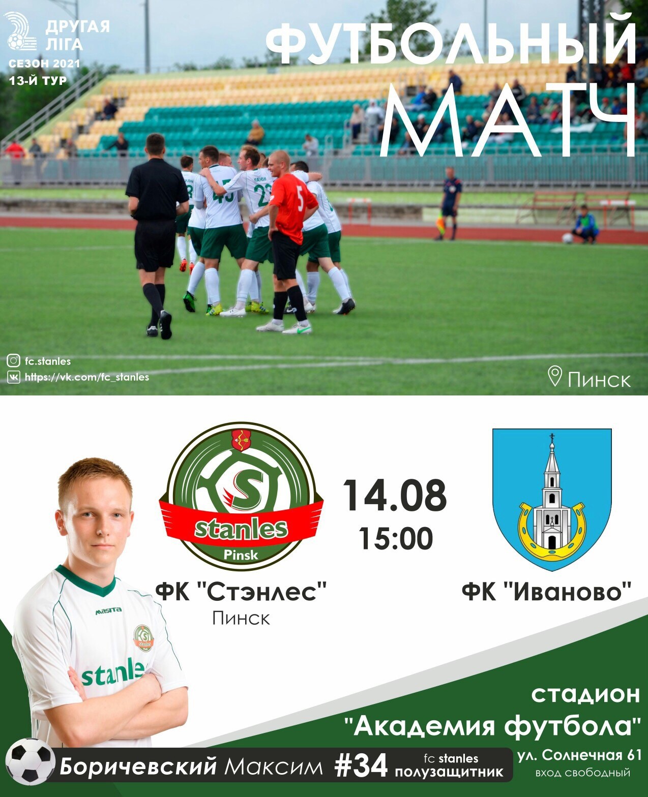 В субботу начнётся 13 тур второй лиги Брестской области зоны «Восток». Пинский «Стэнлес» уже в этом туре может выйти во второй этап соревнований. «Иваново», соперник пинчан в этой встречи, решает гораздо приземлённые задачи. Только во второй раз в этом сезоне игра пройдёт на стадионе Академии футбола.