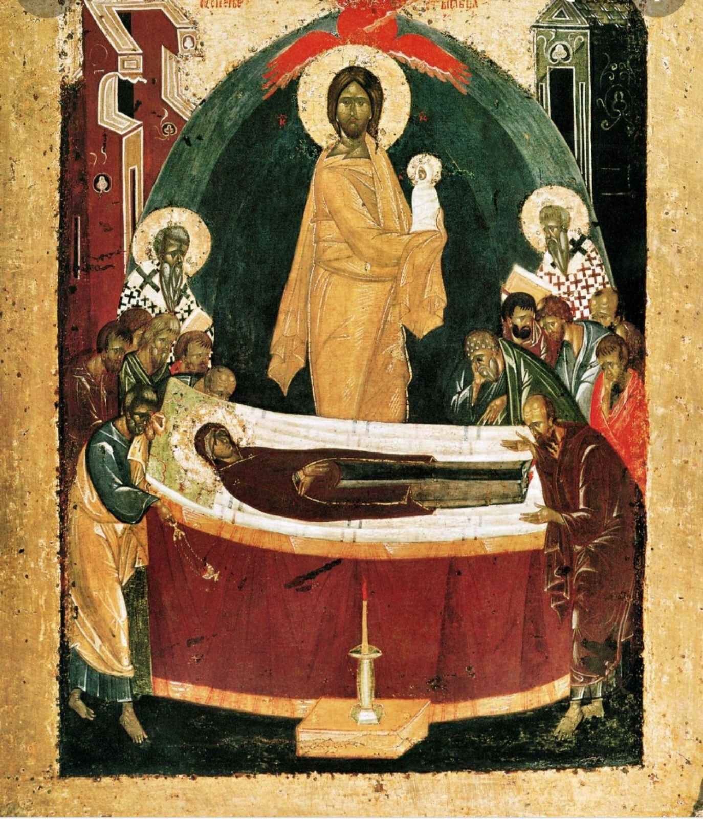 За три дня до кончины Божей Матери явился Архангел Гавриил и сказал, что она перейдет в жизнь небесную, подарив пальмовую ветвь. Сам Иисус сошел на землю и унес тело и душу Богородицы на небеса.