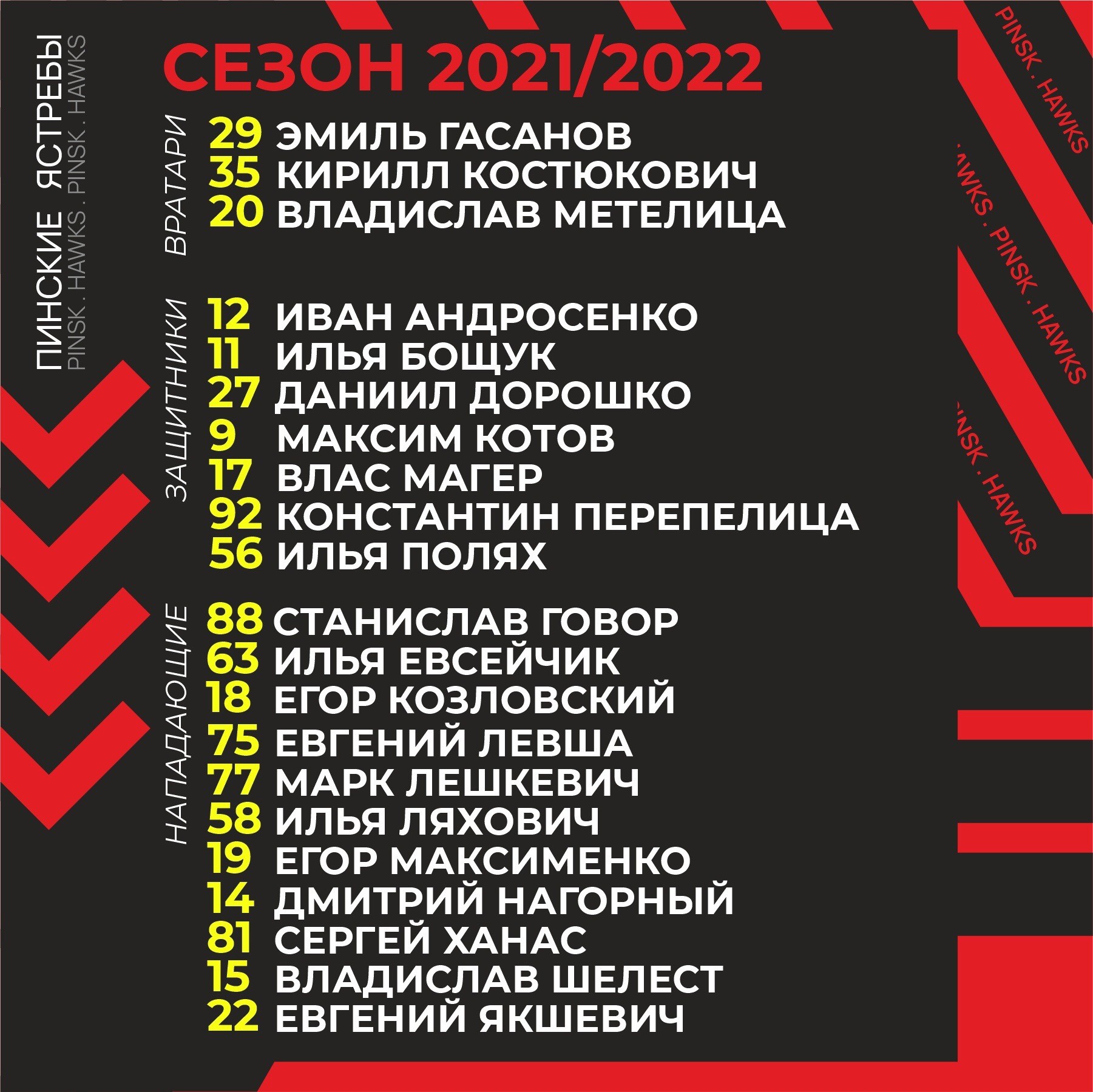 «Пинские ястребы» начнут сезон в обновлённом составе. В заявке у пинчан 21 хоккеист — 3 вратаря, 7 защитников и 11 нападающих. Только один хоккеист остался в «ястребах» с прошлого сезона — пинчанин Максим Котов.