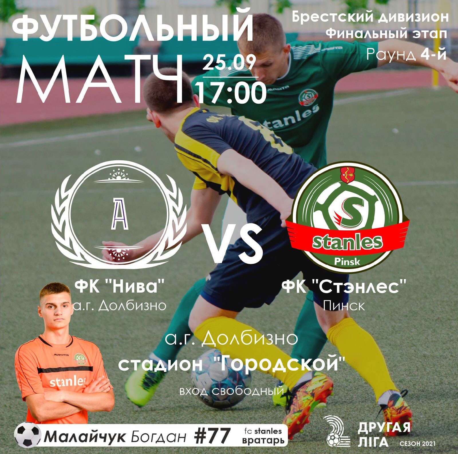 В субботу, 25 сентября, в агрогородке Долбизно Каменецкого района местная «Нива» в последнем 4 туре принимает пинский «Стэнлес». Перед этим туром обе команды («Нива» и «Стэнлес») все ещё имеют свои цели в группе.