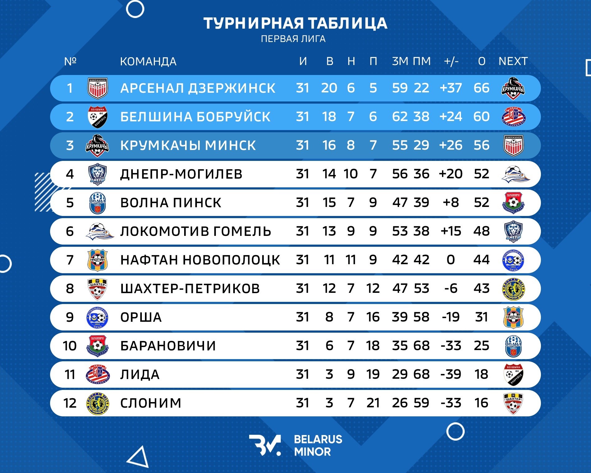 За 2 тура до конца чемпионата на третьей строчке столичные «Крумкачы». Сейчас у них серьезный гандикап в 4 очка перед «Днепром» и «Волной». «Крумкачы» — главный соперник на данный момент для пинчан. Но «Волне» не только необходимо каждый тур оглядываться на результаты столичных «воронов», но и ждать осечки могилевского «Днепра».