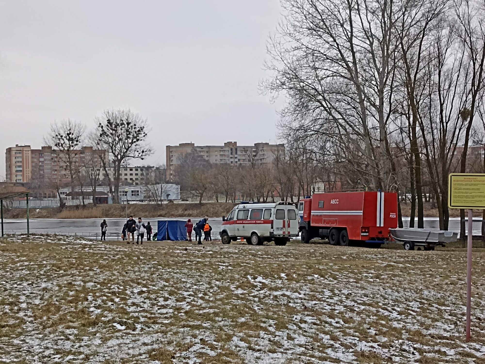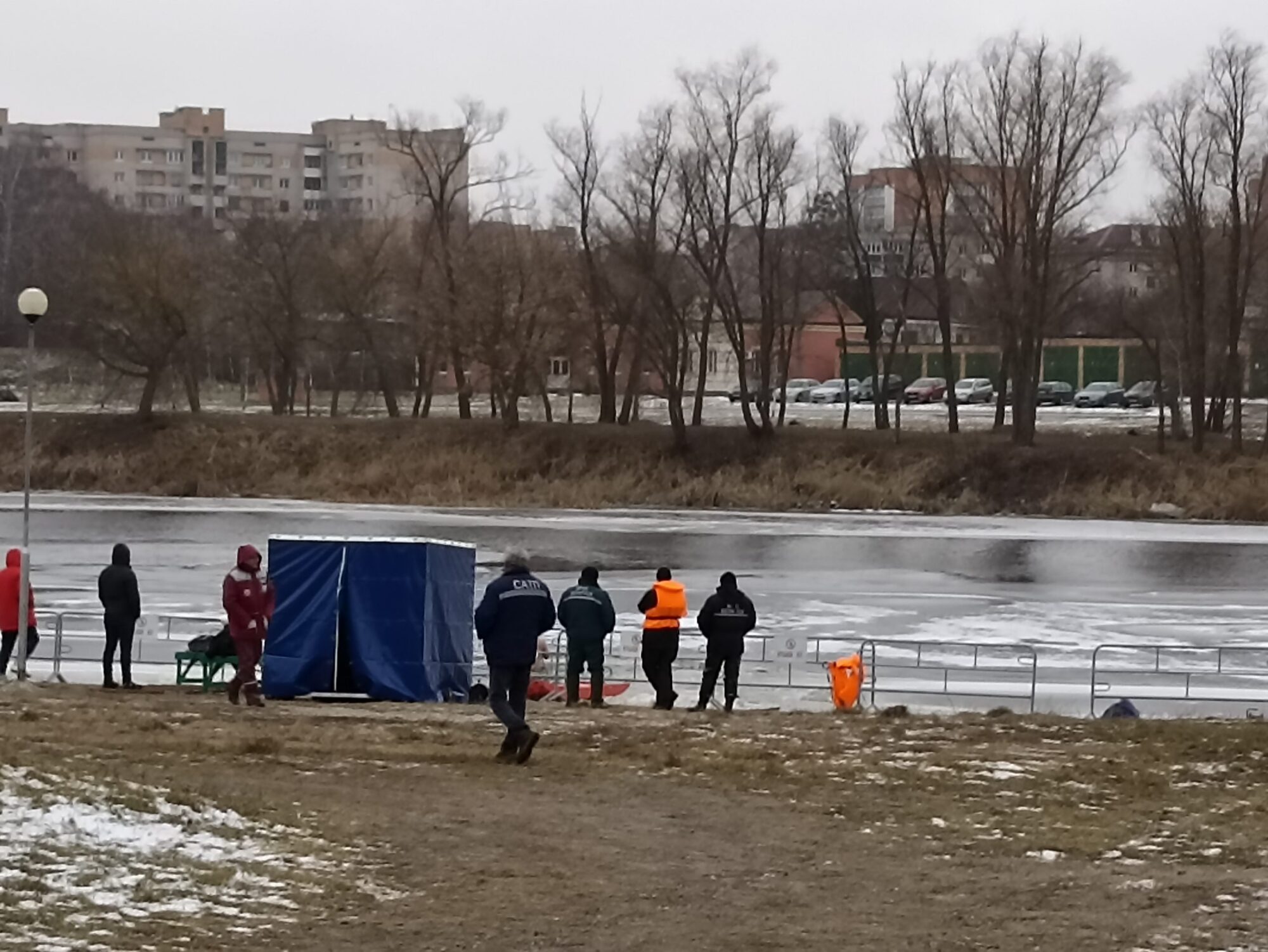 В среду, 19 января, ближе к вечеру (16:30) небольшой толпой пинчане активно шли в сторону городского пляжа. И при входе на него на парковке было несколько машин, такси. В этот же момент приехала вторая скорая помощь. Оказалось — смена дежурства, на пляже так и осталось по одной машине скорой помощи и МЧС.