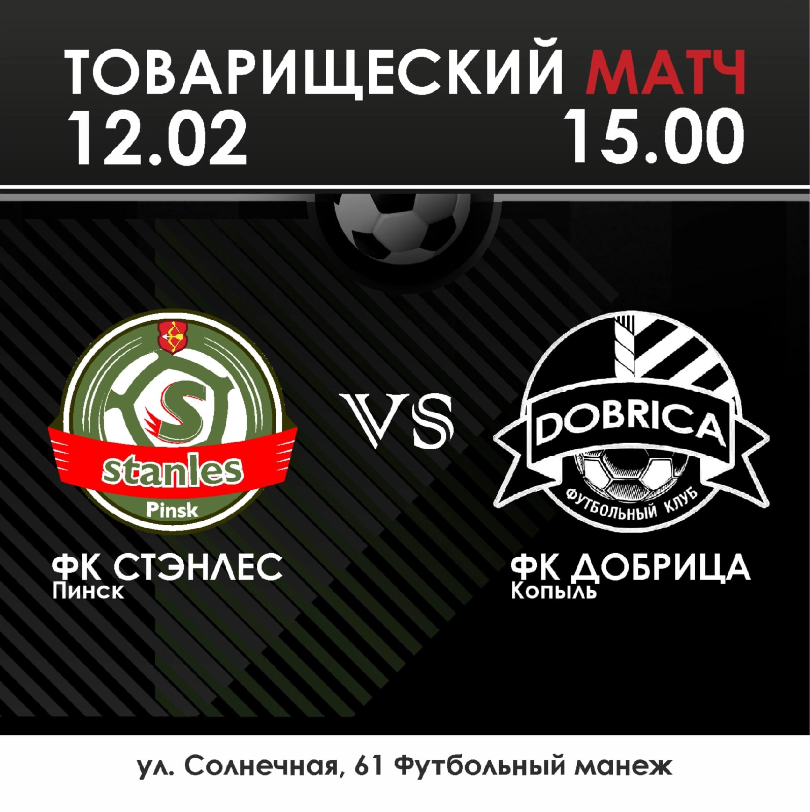 Матч «Стэнлес» — «Добрица» (Копыль) начнется в субботу в 15:00 в манеже Академии футбола.