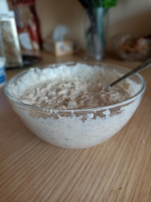-С банки консервированного тунца слить всю жидкость. Размельчить мелко в тарелке с помощью вилки;