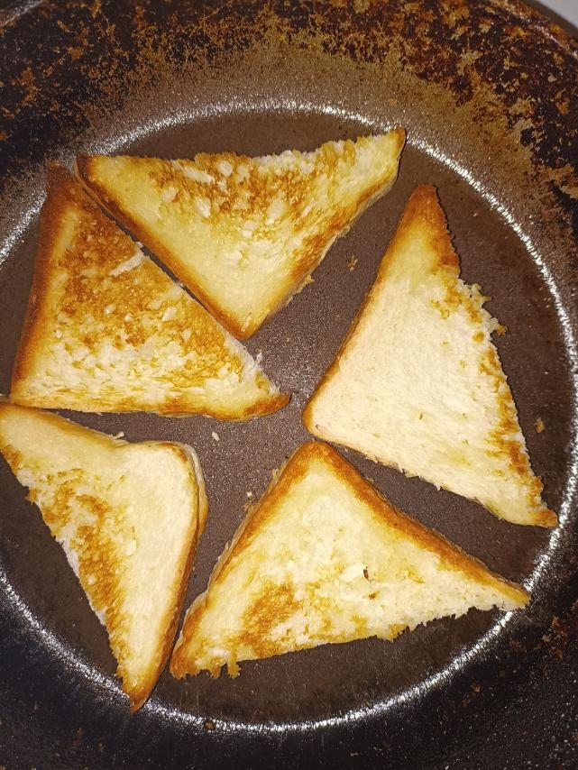 -Ломтики батона разделить на две части, обжарить в течение 1-2 минут на среднем огне до золотистой корочки;
