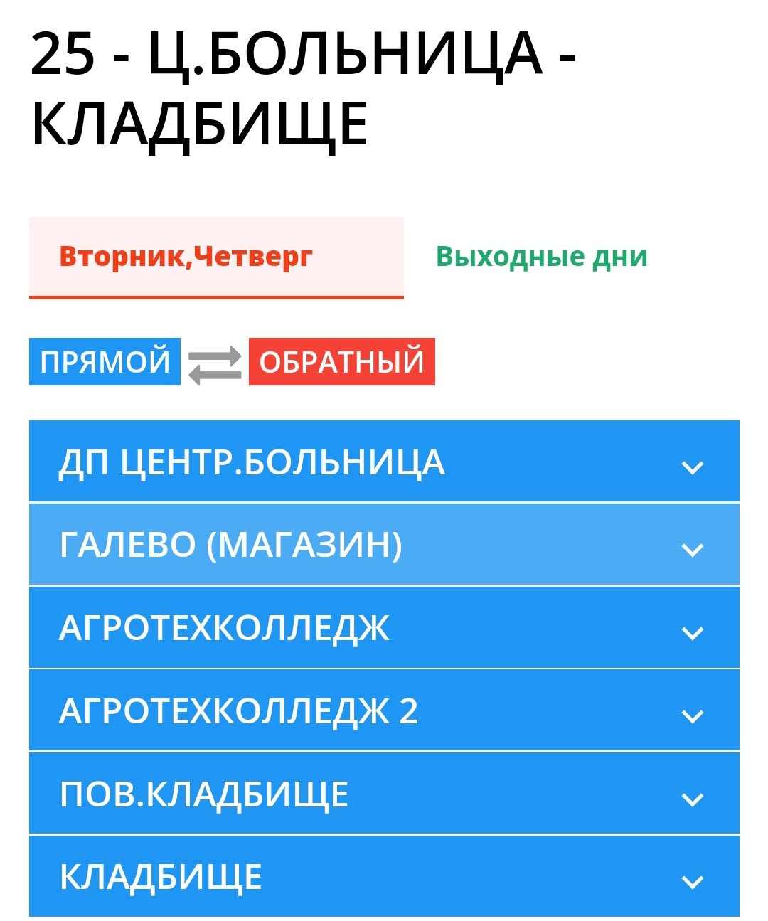 По стандартному расписанию автобус №25 ходит 4 раза в неделю — вторник, четверг, суббота и воскресенье. Автобус начинает движение от центральной больницы (12-этажки), а в маршруте 6 остановок.