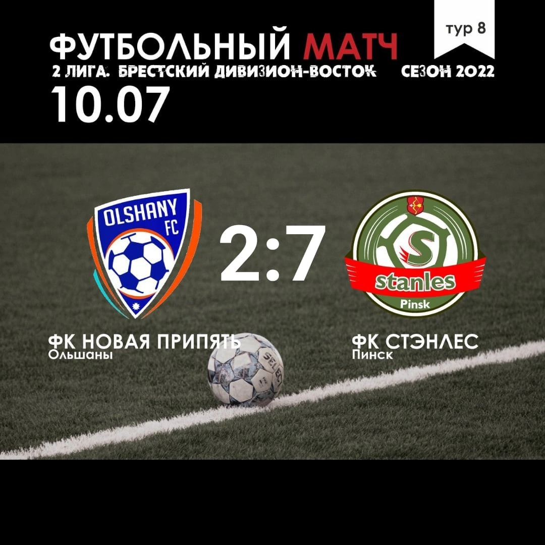 Пинский «Стэнлес» в перенесенной встрече восьмого тура разгромил на выезде «Новую Припять» — 2:7. Матч в агрогородке Ольшаны между вторым и первым местом турнирной таблицы не оказался напряжённым и боевым. «Новая Припять» смогла «распечатать» счёт уже во втором тайме, когда игра была предрешена.