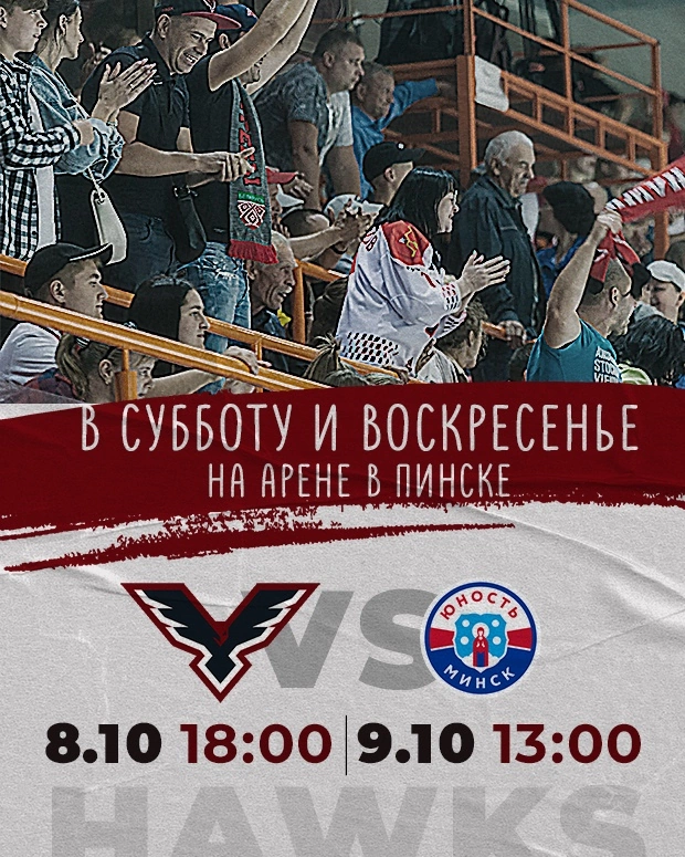 Воскресенье, 9 октября, в 13:00. Хоккей. «Ястребы» (Пинск) — «Юниор» (Минск).