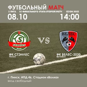 Суббота, 8 октября, в 14:00. Футбол. «Стэнлес» (Пинск) — «Велес-2020» (Витебск).