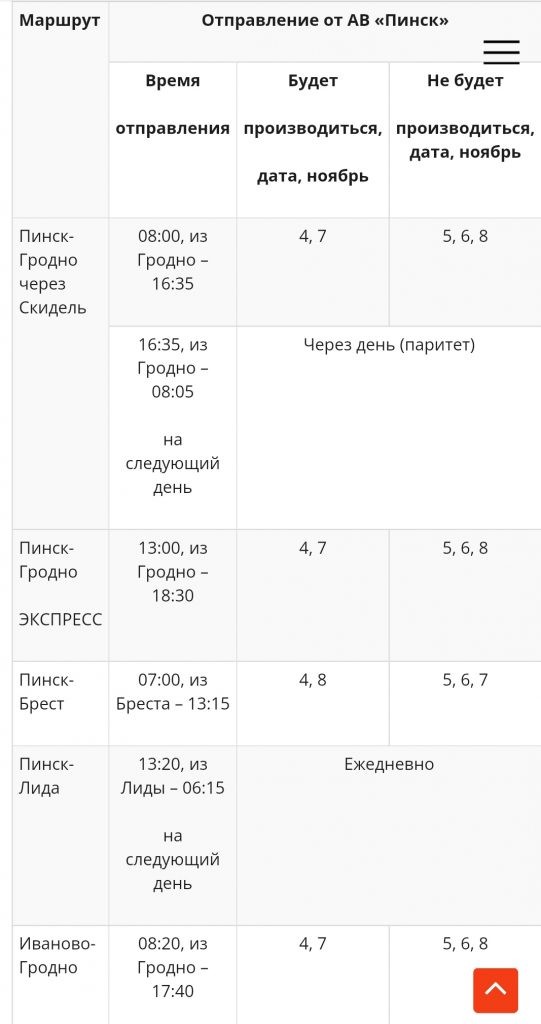 Что касается непосредственно 7 ноября, дня Октябрьской революции, то не будет автобуса Пинск — Брест. Также не поедет в этот день автобус Пинск — Гродно (через Скидель) в 16:35.