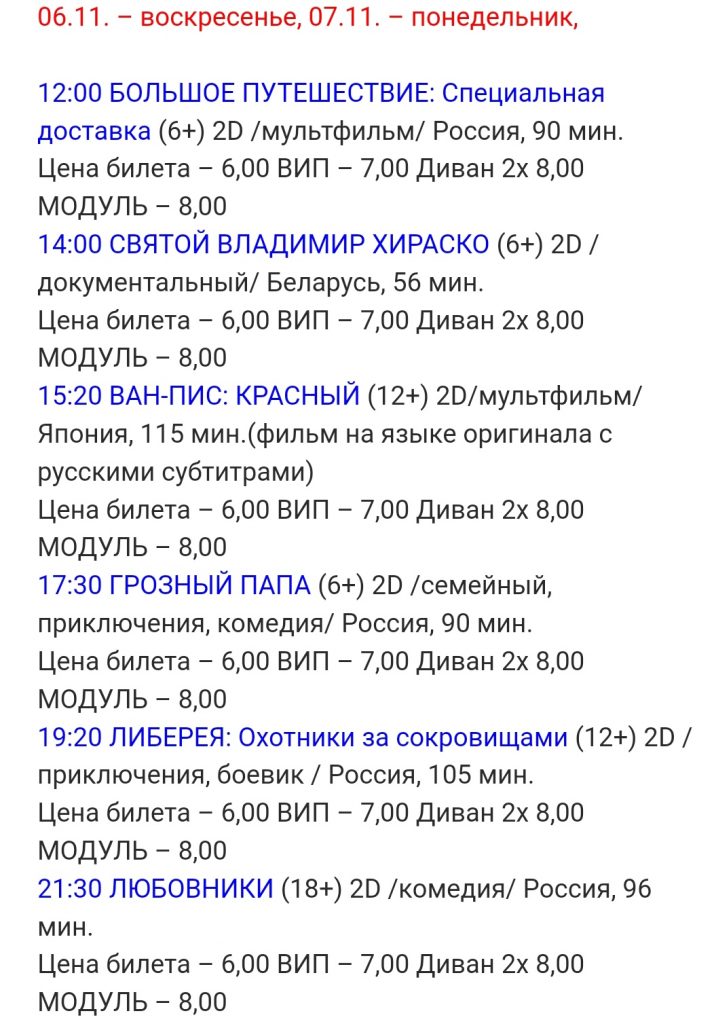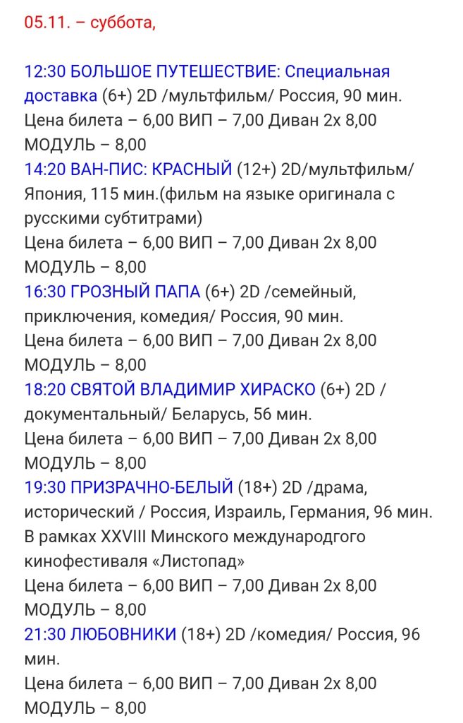 Плюсы. Хороший выбор фильмов различных жанров. Сразу два мультфильма в один день для детей, две комедии российского производства также на выбор. А на закуску — белорусская документалка.