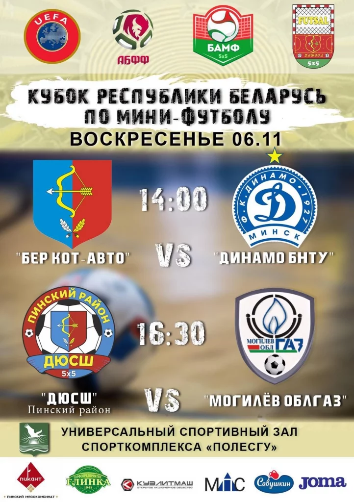 Второй матч чуть позже, в 16:30. ДЮСШ (Пинский район) — «Могилев облгаз». Также в рамках 1/16 кубка Беларуси по мини-футболу.