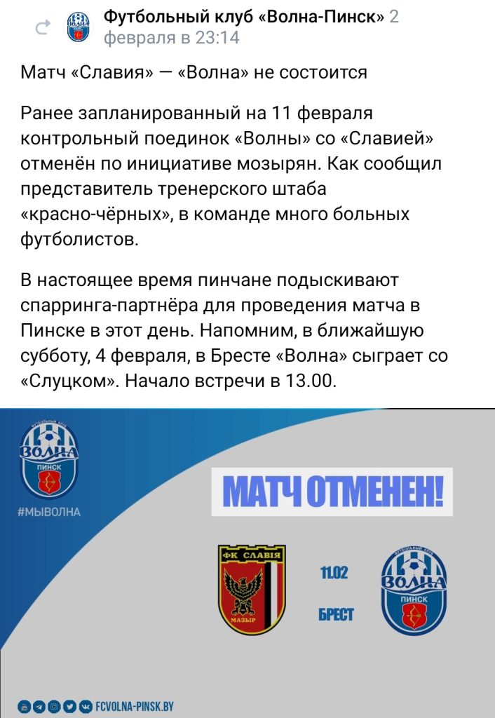 Мозыряне всё же после товарищеской игры с БАТЭ (проигрыш 0:3) поведали, что состав усечённый, ряд игроков болеет. Но все же «Славия» в такой ситуации проводит матчи. А замена соперника на 11 февраля объясняется просто — «Неман» все же постатуснее «Волны» (клуб из Гродно выступает в высшей, а пинчане — в первой лигах — прим.).