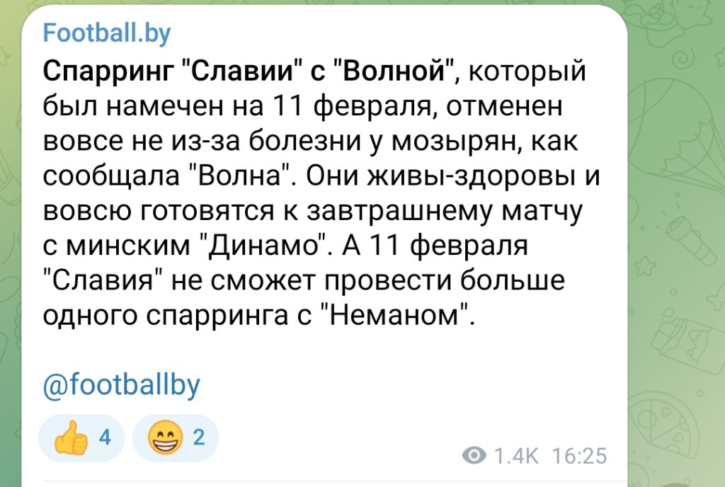 Однако в четверг, 2 февраля, пинский клуб в соцсетях объявил, что спарринг со «Славией» не состоится. Тренерский штаб мозырян сообщил о том, что в команде много заболевших футболистов.