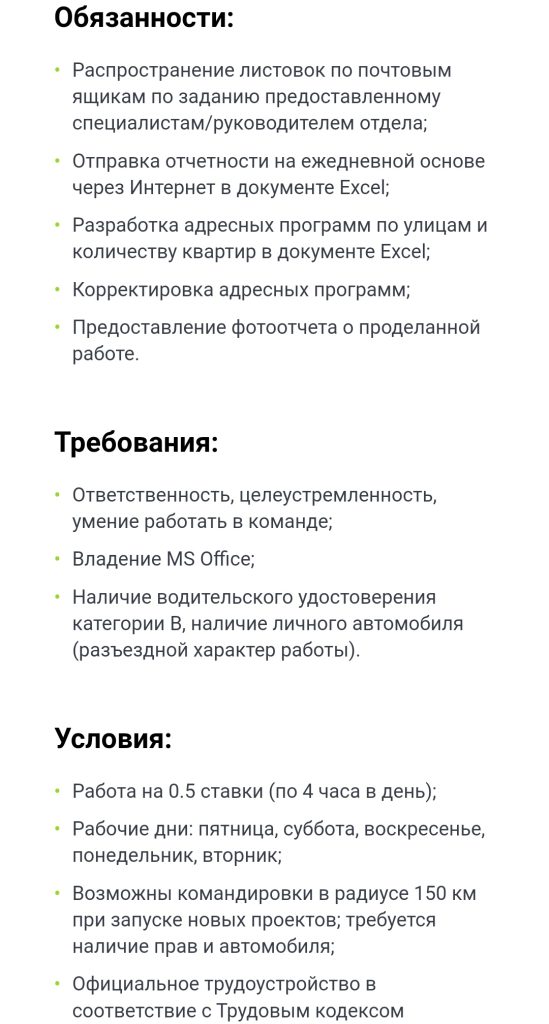 Вакансия предполагает достаточно много обязанностей (9 пунктов). Можно обогатиться при подработке на сумму от 900 до 1100 рублей.