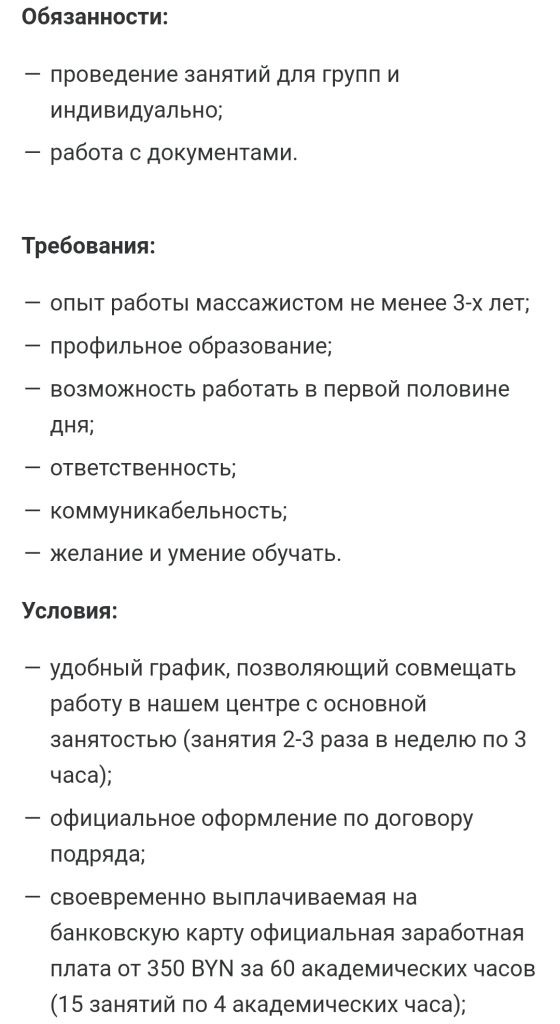 ООО «Древо знаний» (учебный центр республики, работающий в 16 городах страны — прим.) приглашает массажиста (преподавателя). Сразу известны и объемы работ, и заработная плата — за 60 академических часов (15 занятий по 4 академических часа) заплатят от 350 рублей.