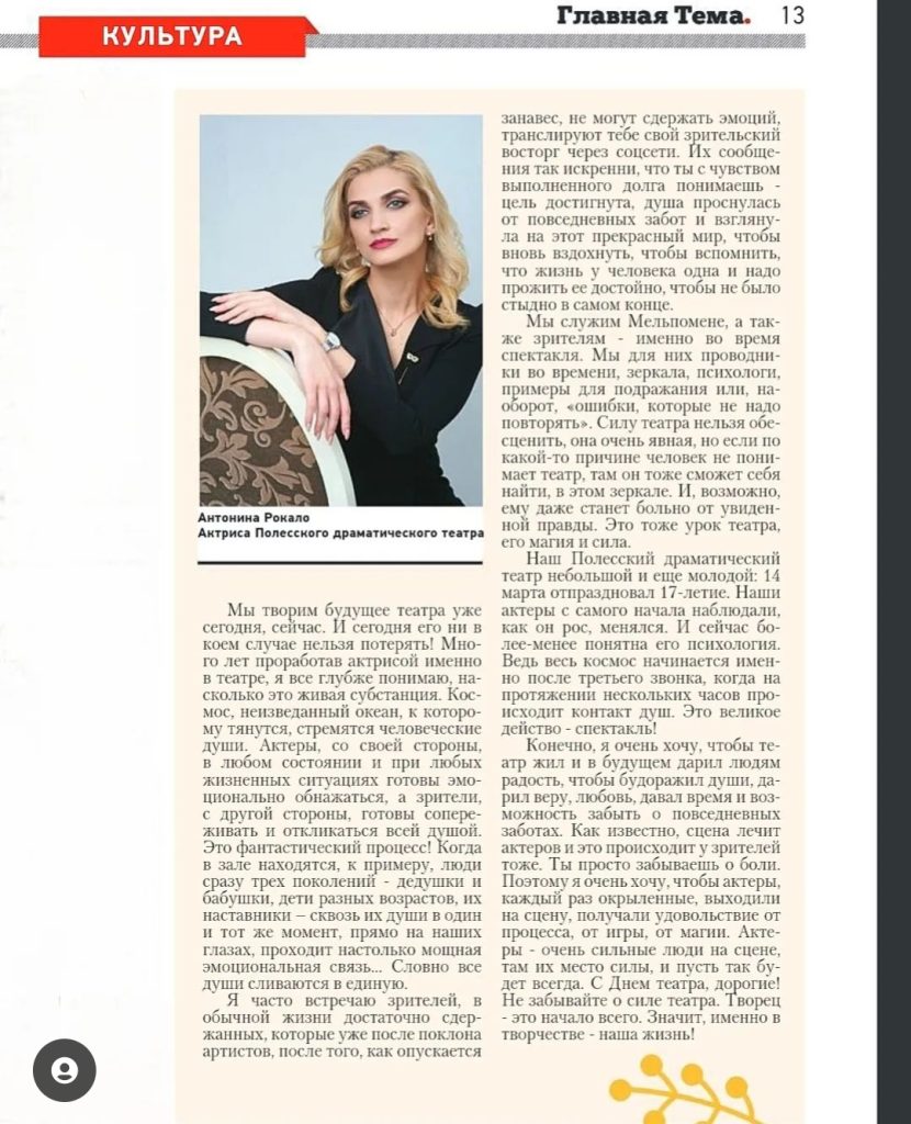 Незадолго до Всемирного дня театра смоленское региональное СМИ «Главная Тема.См» узнало мнение о современном театре у белорусских и смоленских актеров. Представляем искренний и эмоциональный монолог пинской актрисы: