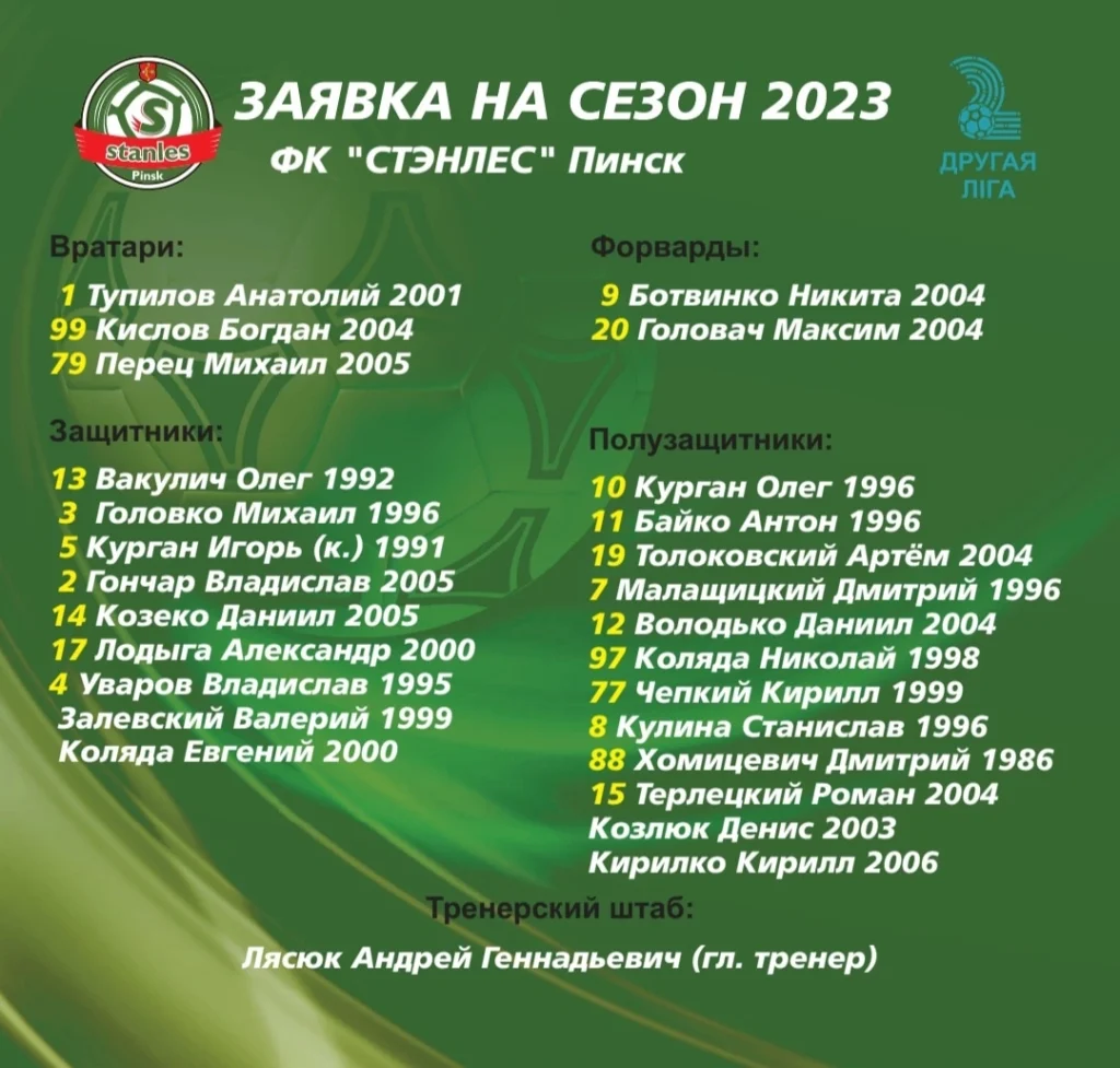 Грядет футбольный сезон во второй лиге в Пинске. Уже в эти выходные «Стэнлес» откроет чемпионат домашней игрой с «соседями» из Иваново. Зимнее межсезонье закончено. Андрей Лясюк впервые провел его полноценно в качестве главного тренера «Стэнлеса». Три месяца подготовки, пять товарищеских игр и девять новичков в команде.