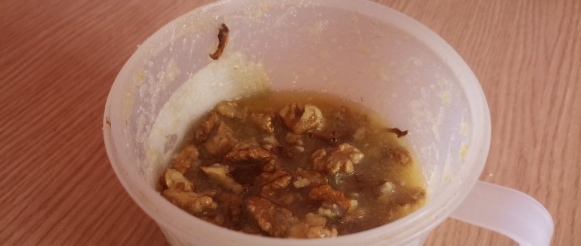 — в эту же ёмкость добавляем грецкие орехи. Можно измельчить их вручную, можно добавлять и целые кусочки;