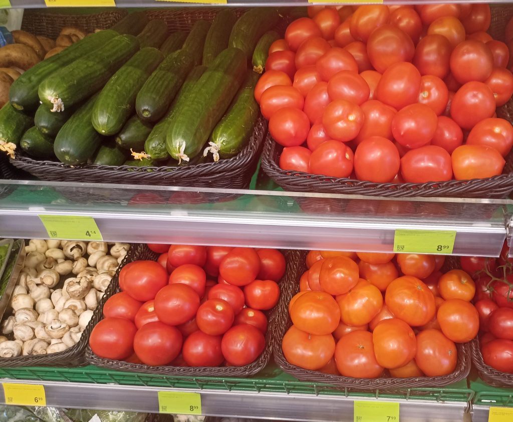 А вот огурец здесь дороже. Правда, гладкий, но не такая уж разница, какой нарезать в салат? 4,14 рублей за килограмм.