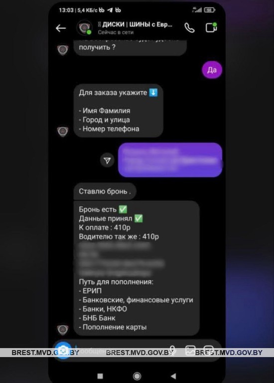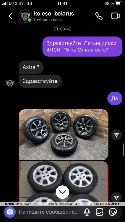 В социальной сети “Инстаграм” мужчина нашел интернет-магазин, специализирующийся на продаже автомобильных дисков и шин. Выбрав понравившуюся модель дисков, столинец связался с продавцом, который попросил внести предоплату для доставки товара. Покупатель перевел 581 рубль по предоставленной ссылке.