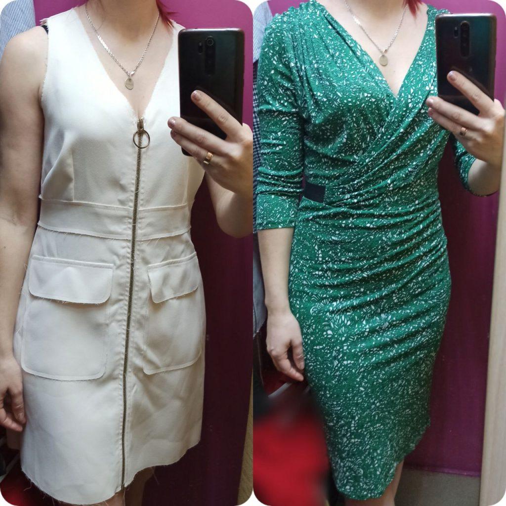 В отличном состоянии и на мой вкус нашлось только две единицы. Белое платье без рукавов бренда TOPSHOP. Зелёное не в моём вкусе, но всё же решила примерять. Состояние идеальное у двоих.
