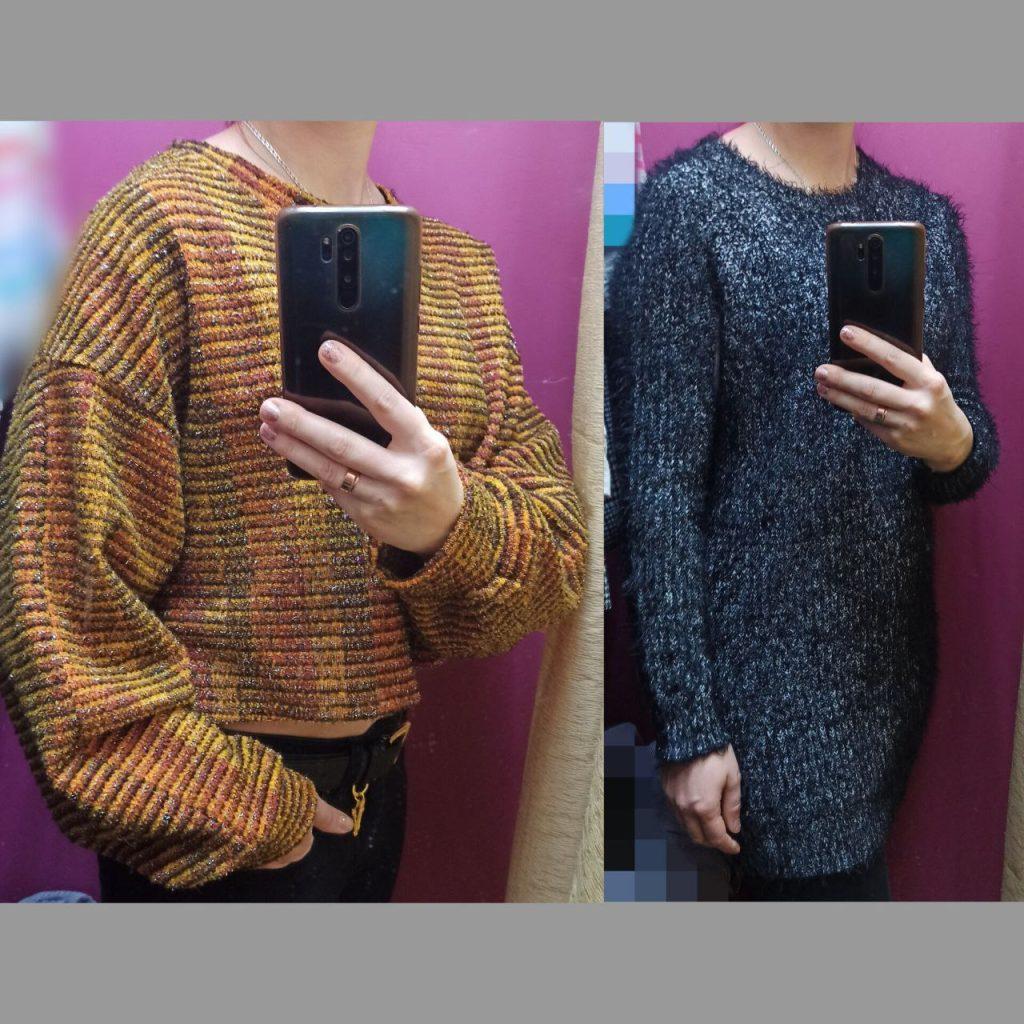 Укороченная кофта с объёмными рукавами оказалась бренда ZARA. А чёрный удлинённый свитер станет элементом повседневного образа.
