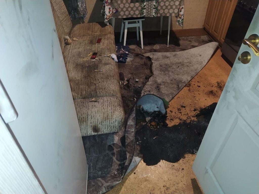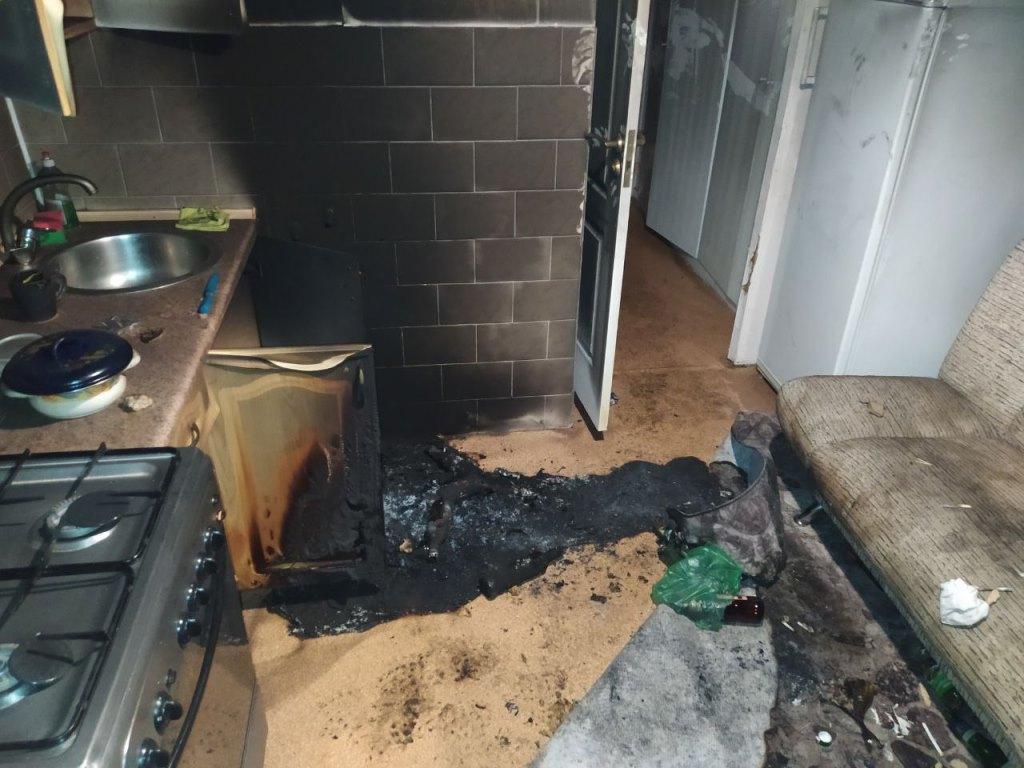 Сообщается, что огонь повредил ковер, напольное покрытие (линолеум) на площади 1 квадратный метр, кухонную мебель. Закопчены стены и потолок в квартире. Причина пожара устанавливается.