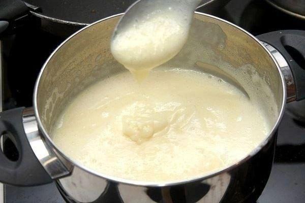 В эту массу выливаем молоко. Перемешиваем. Ставим на медленный огонь и варим до загустения, непрерывно помешивая. Консистенция должна напоминать густую сметану. После того, как крем будет готов, снимаем с плиты и даём остудиться.