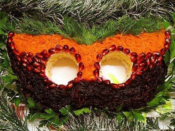 - Слои: половина курицы — морковь — картофель — грецкие орехи — половина свеклы — грецкие орехи — жареный лук — оставшаяся курица — яйца — оставшаяся свекла.