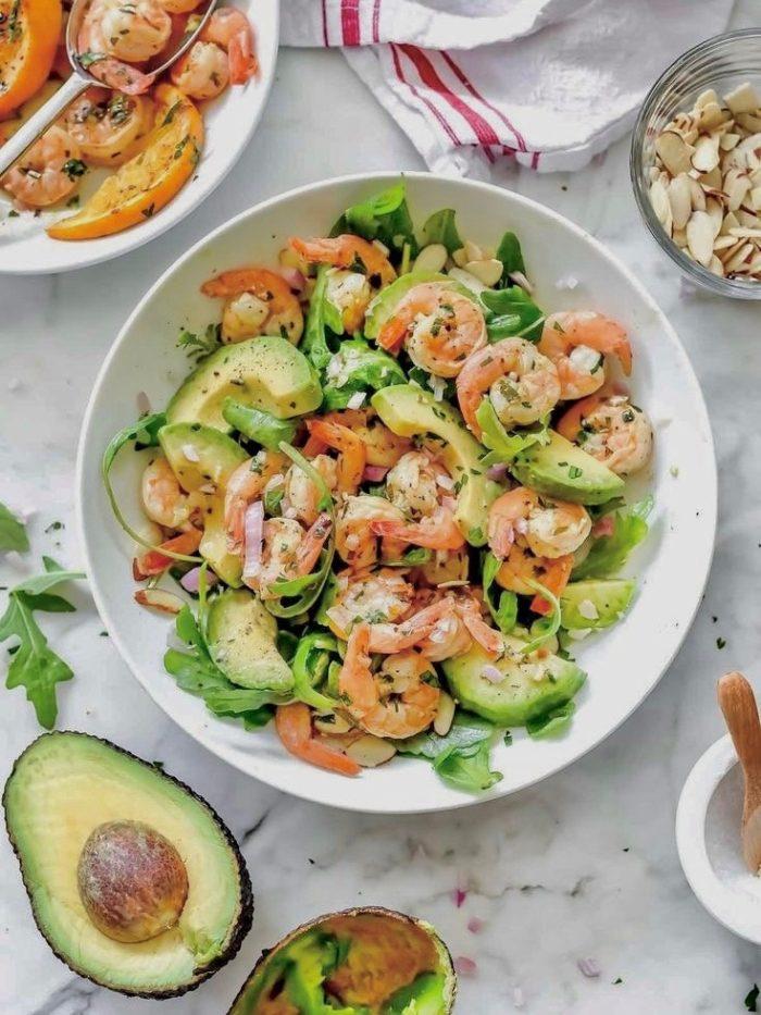 - Собираем салат: выкладываем рукколу, помидоры черри, мякоть апельсина, сочное авокадо, сыр фета кубиками и обжаренные креветки