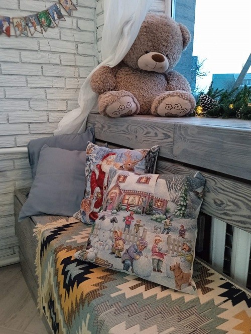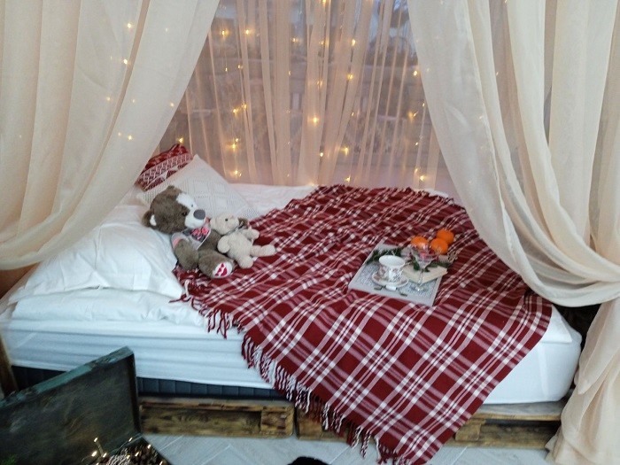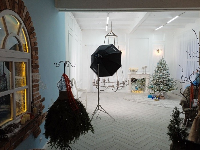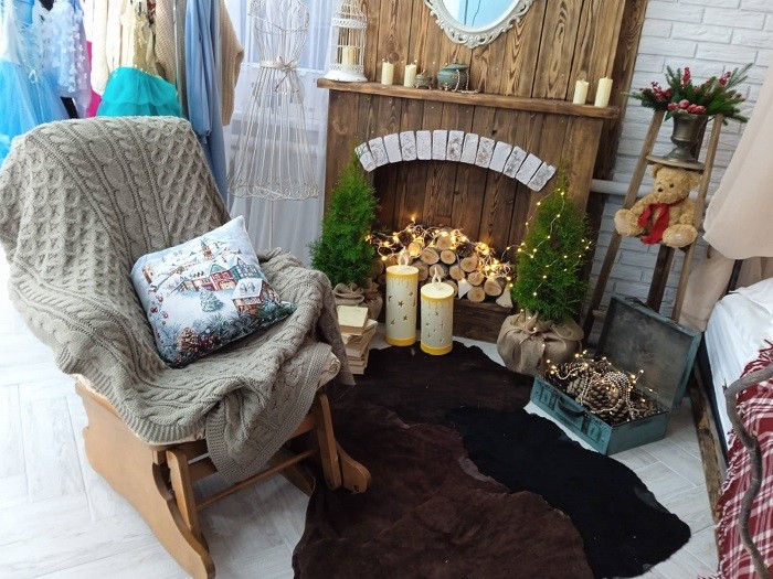 Есть здесь кровать из поддонов с балдахином, два камина в разных стилях, кресла с пледами, ковер с декоративными подушками, деревянный подоконник со ступенями, фальш-окно, нарядная елка, обилие свечей, мягких игрушек, книг, шишек и прочей мелочевки, создающей комфорт и настроение. Из профессионального оборудования: два источника постоянного света, софт-боксы, отпариватель и т.д. В целом, хорошая база, которая со временем будет дополняться и расширяться.