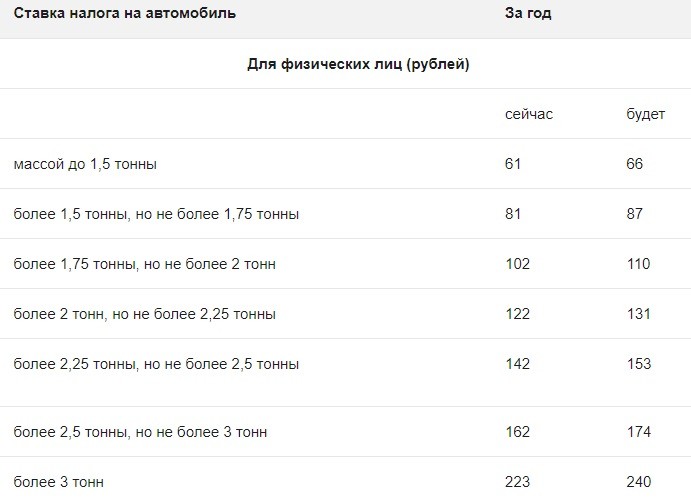 Сумма транспортного налога зависит от разрешенной максимальной массы, вместимости или прописана за одну единицу транспортного средства. Возьмем, к примеру, автомобиль с разрешенной максимальной массой до 1,5 тонны. Сейчас за него нужно платить 61 рубль в год, а повысят до 66 рублей.
